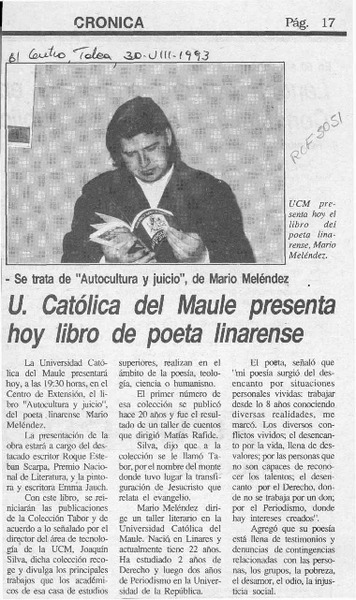 U. Católica del Maule presenta hoy libro de poeta linarense [artículo].