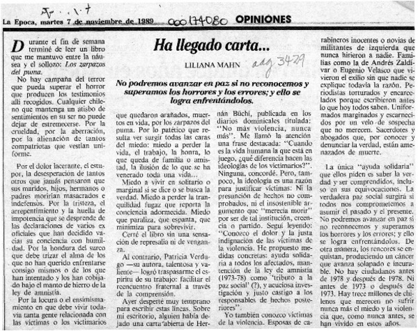 Ha llegado carta -- [artículo] Liliana Mahn.