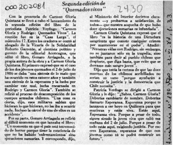 Segunda edición de "Quemados vivos" [artículo].
