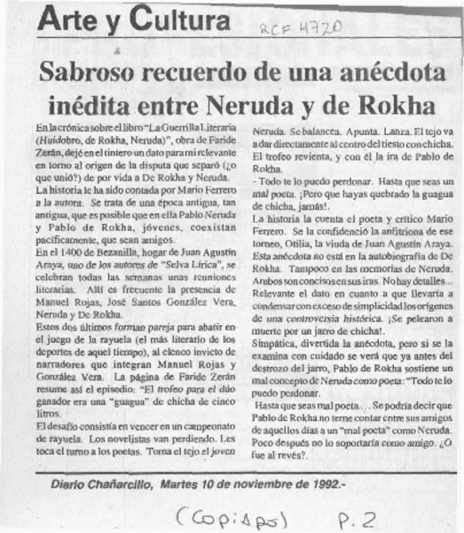 Sabroso recuerdo de una anécdota inédita entre Neruda y de Rokha [artículo].