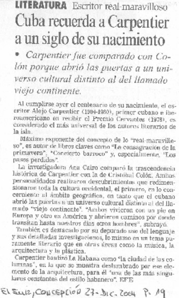 Cuba recuerda a Carpentier a un siglo de su nacimiento [artículo].