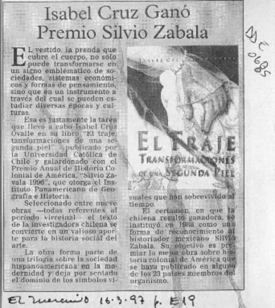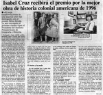 Isabel Cruz recibirá el premio por la mejor obra de historia colonial americana de 1996 [artículo] M. A C.