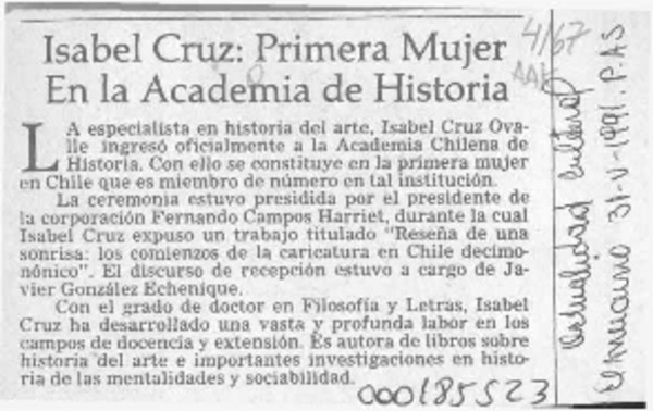 Isabel Cruz, primera mujer en la Academia de Historia [artículo].