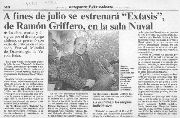A fines de julio se estrenará "Extasis" de Ramón Griffero, en la sala Nuval [artículo]