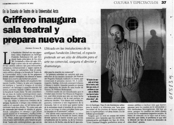 Griffero inaugura sala teatral y prepara nueva obra [artículo] Andrés Gómez B.