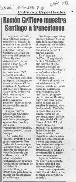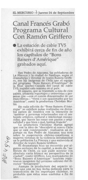 Canal francés grabó programa cultural con Ramón Griffero [artículo].