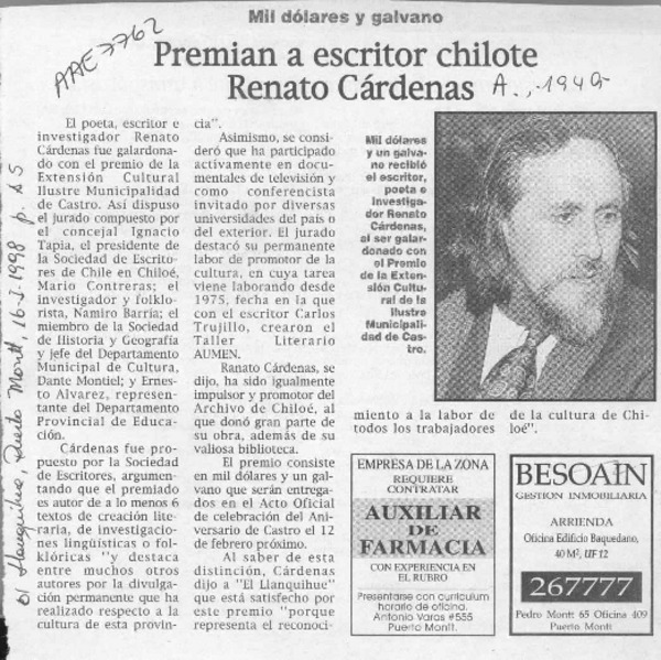 Premian a escritor chilote Renato Cárdenas [artículo].