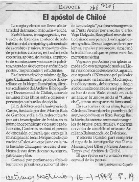 El apóstol de Chiloé [artículo] Enrique Ramírez Capello.