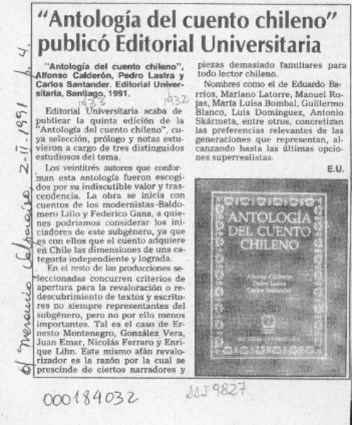 "Antología del cuento chileno" publicó editorial Universitaria [artículo] E. U.