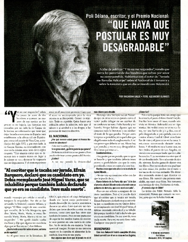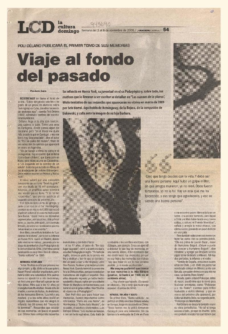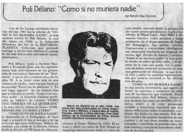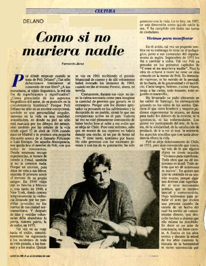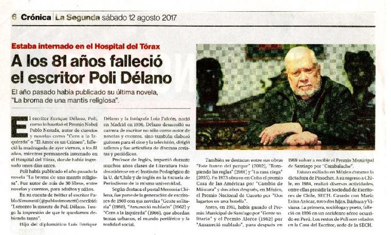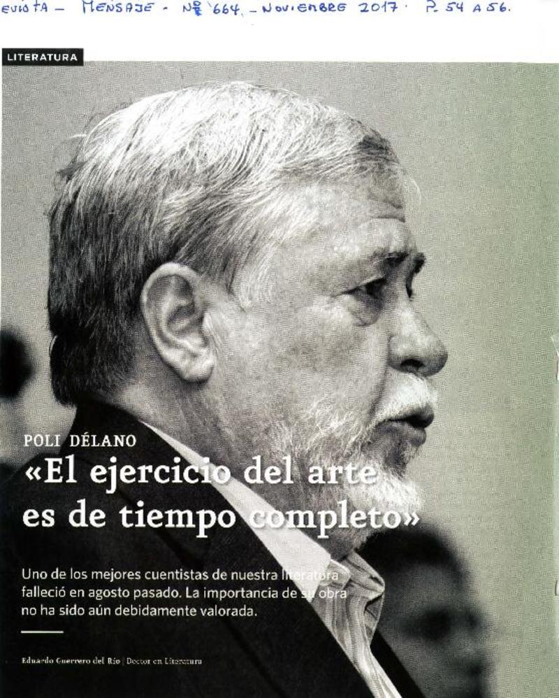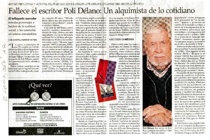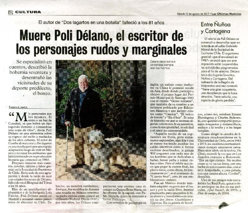 El autor de "Dos lagartos en una botella" fallecio a los 81 años Muere Poli Délano, el escritor de los personajes rudos y marginales [artículo] : Fabian Llanca.