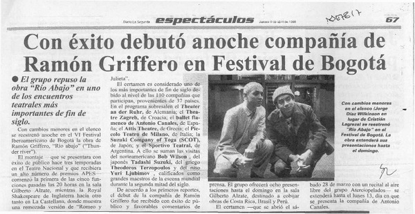 Con éxito debutó anoche compañía de Ramón Griffero en Festival de Bogatá [artículo].