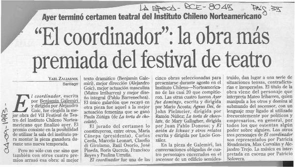 "El coordinador", la obra más premiada del festival de teatro [artículo] Yael Zaliasnik.