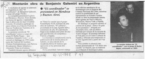 Montarán obra de Benjamín Galemiri en Argentina [artículo].