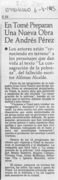 En Tomé preparan una nueva obra de Andrés Pérez [artículo].