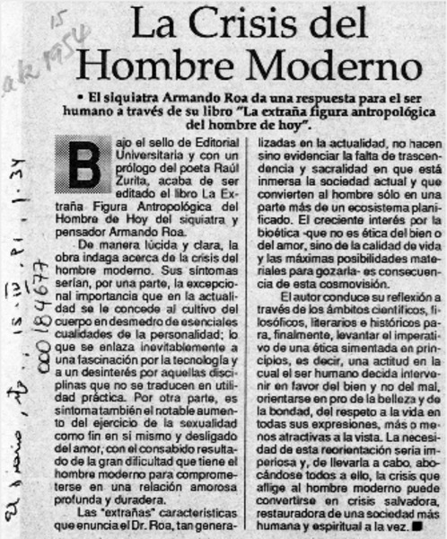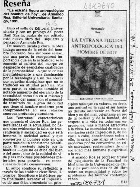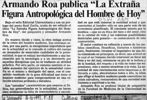 Armando Roa publica "La extraña figura antropológica del hombre de hoy" [artículo].