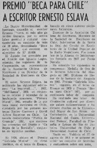 Premio "Beca para Chile" a escritor Ernesto Eslava. [artículo]
