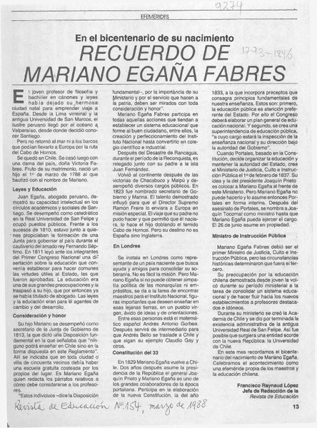 Recuerdo de Mariano Egaña Fabres [artículo] Francisco Raynaud López.