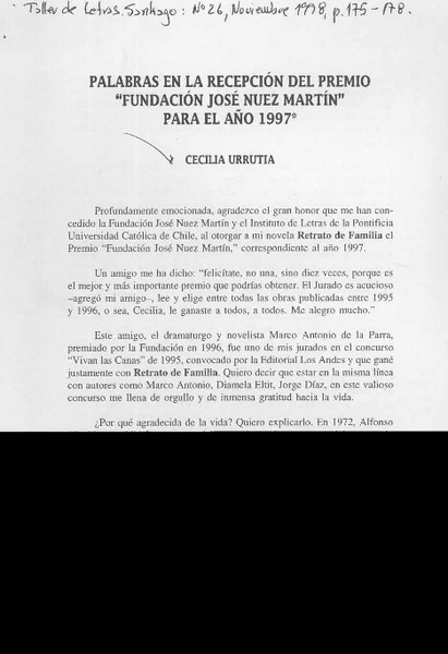 Palabras en la recepción del Premio "Fundación José Nuez Martín" para el año 1997 [artículo] Cecilia Urrutia.