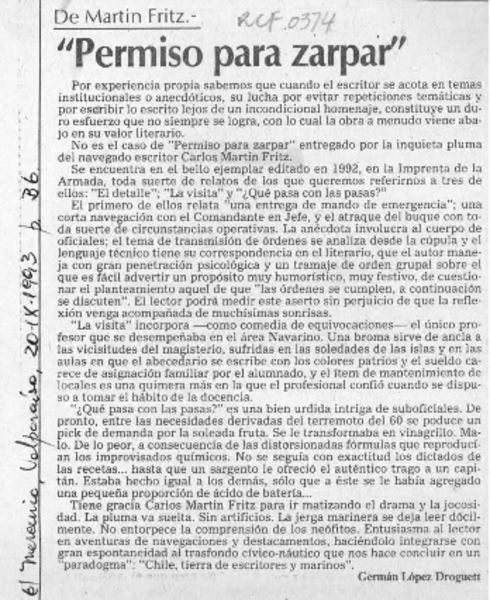 "Permiso para zarpar" [artículo] Germán López Droguett.