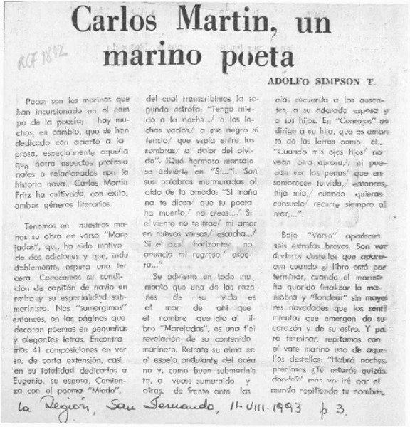 Carlos Martin, un marino poeta [artículo] Adolfo Simpson T.