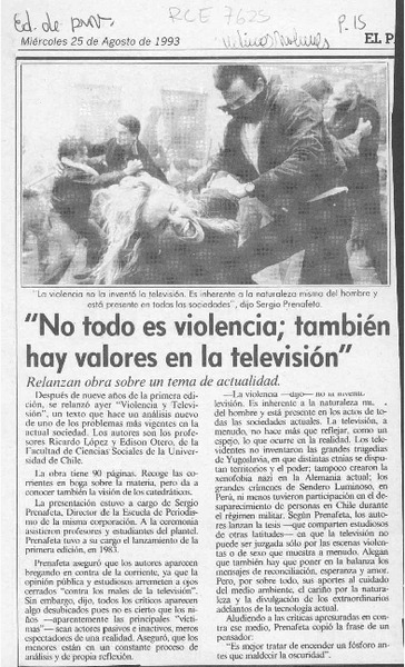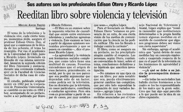 Reeditan libro sobre violencia y televisión [artículo] Miguel Angel Fredes.