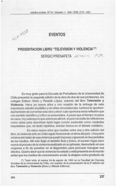 Presentación libro "Televisión y violencia" [artículo] Sergio Prenafeta.