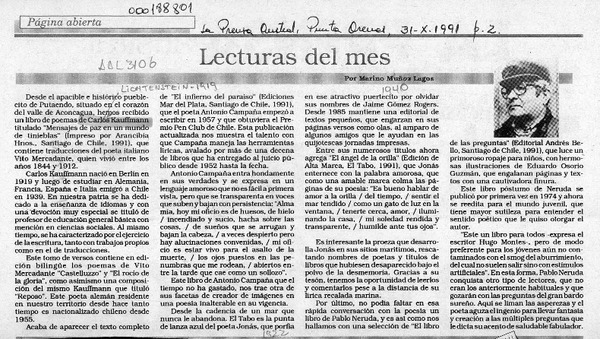 Lecturas del mes [artículo] Marino Muñoz Lagos.
