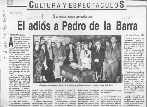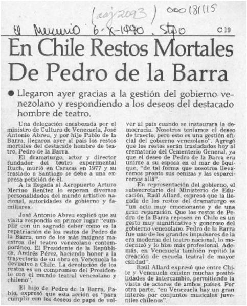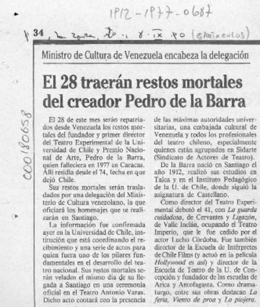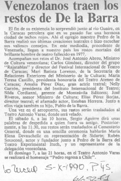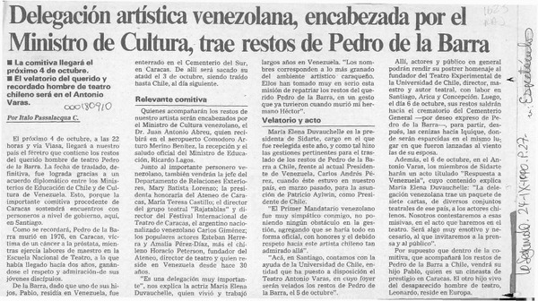 Delegación artística venezolana, encabezada por el Ministro de Cultura, trae restos de Pedro de la Barra [artículo] Italo Passalacqua C.