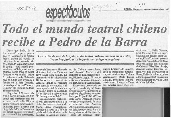 Todo el mundo teatral chileno recibe a Pedro de la Barra [artículo].
