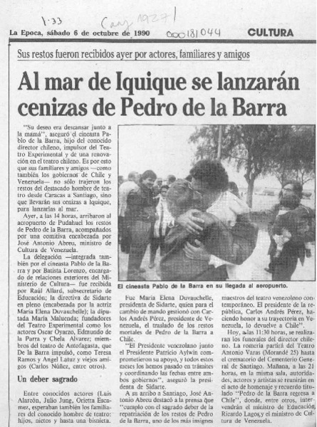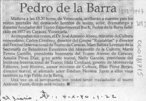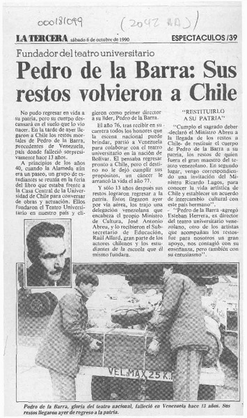 Llegan restos del actor y dramaturgo Pedro de la Barra [artículo].