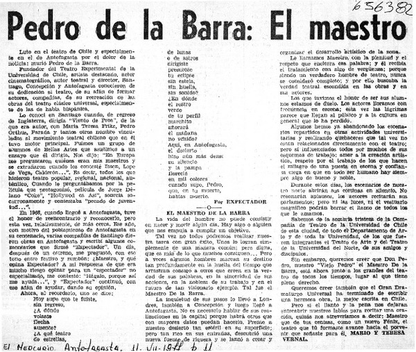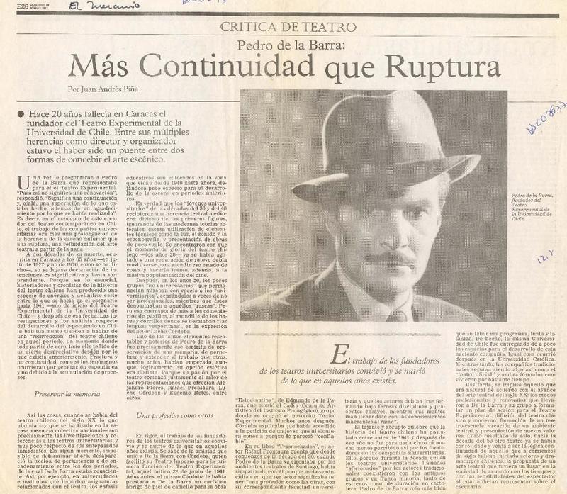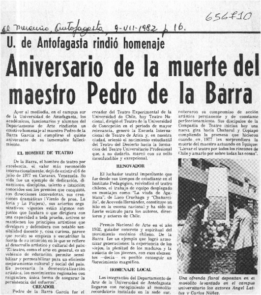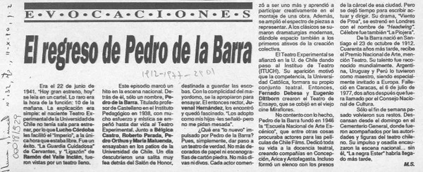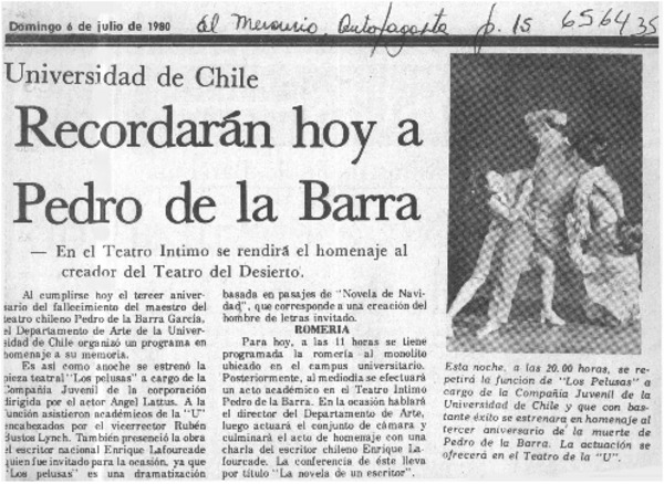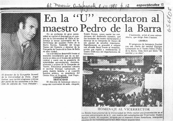 Teatro de la "U" recuerda a maestro Pedro de la Barra. [artículo]
