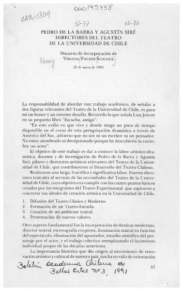 Pedro de la Barra y Agustín Siré, directores del Teatro de la Universidad de Chile [artículo] Virginia Fisher Scolnick.