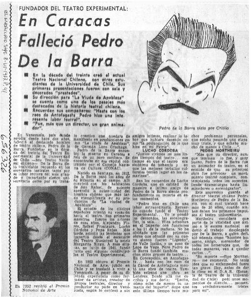 Pedro de la Barra pasó a la historia del teatro [artículo] O. M. R.