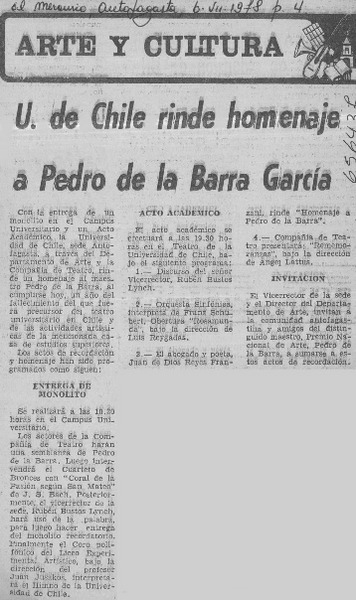 Homenaje a Pedro de la Barra rendirá Departamento de Arte de U. de Chile. [artículo]