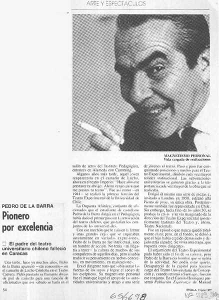 Pedro de la Barra, pilar del teatro chileno [artículo] Myriam Olate.