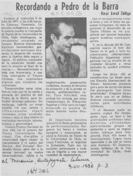 Recordando a Pedro de la Barra [artículo] Omar Awad Zúñiga.