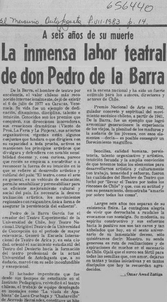 La inmensa labor teatral de don Pedro de la Barra [artículo] Omar Awad Zuñiga.