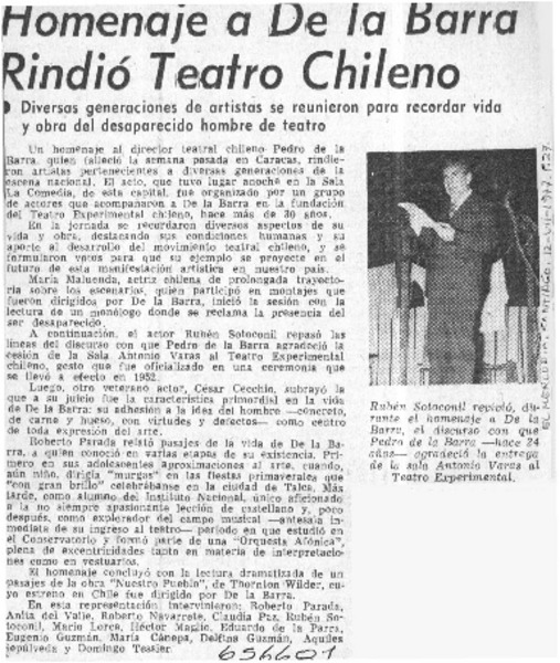 Homenaje a De la Barra rindió teatro chileno. [artículo]