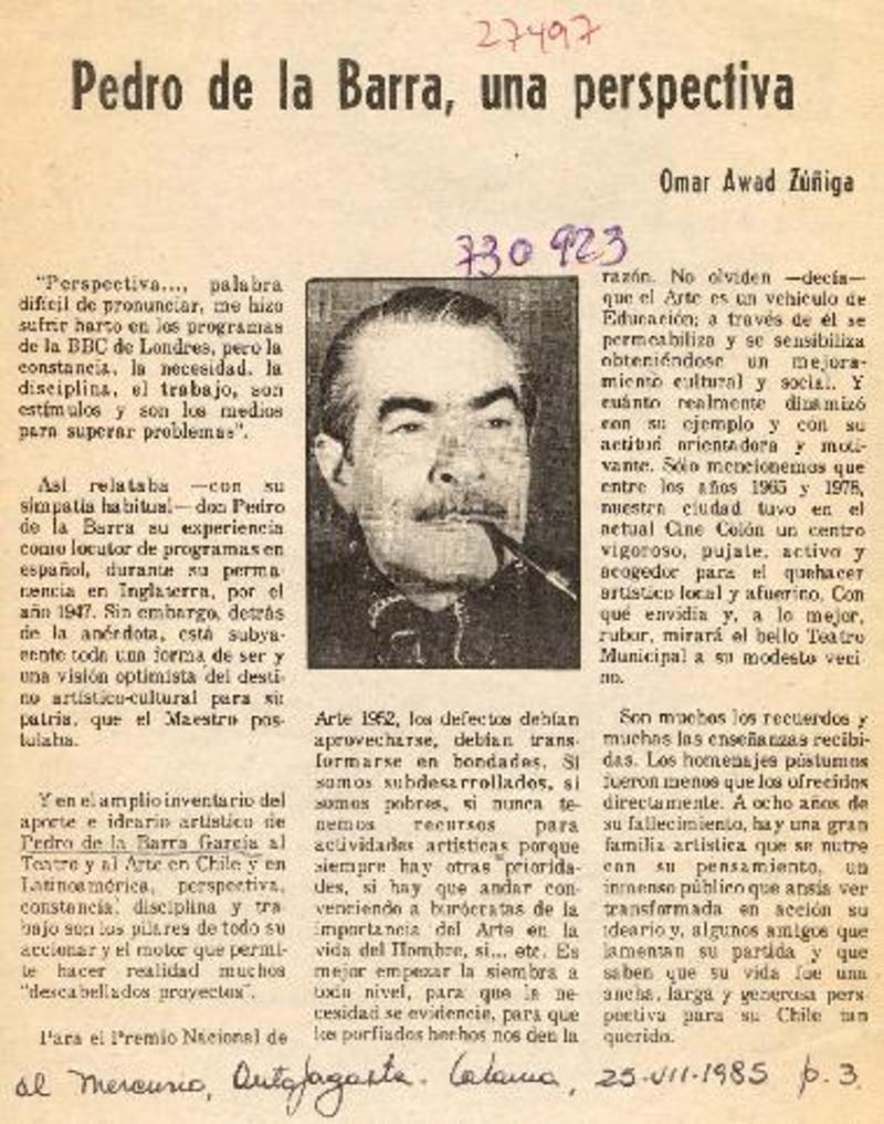 Pedro de la Barra García [artículo] Omar Awad Zúñiga.