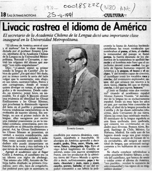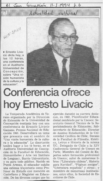 Conferencia ofrece hoy Ernesto Livacic [artículo].