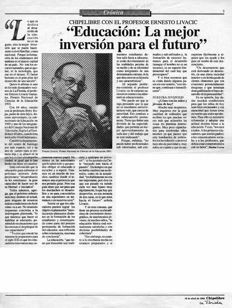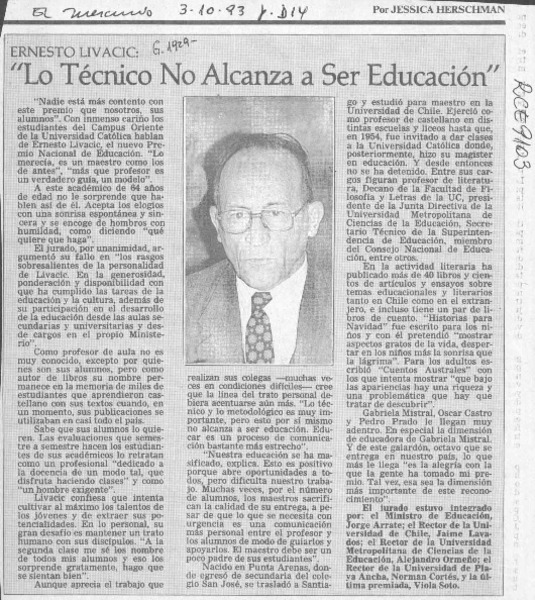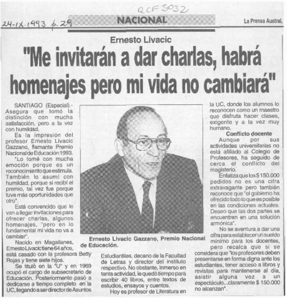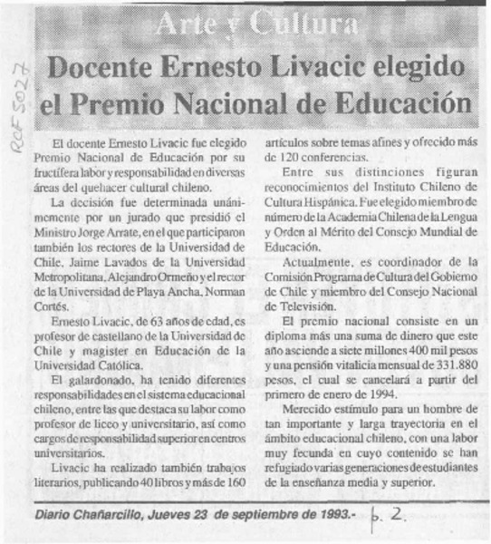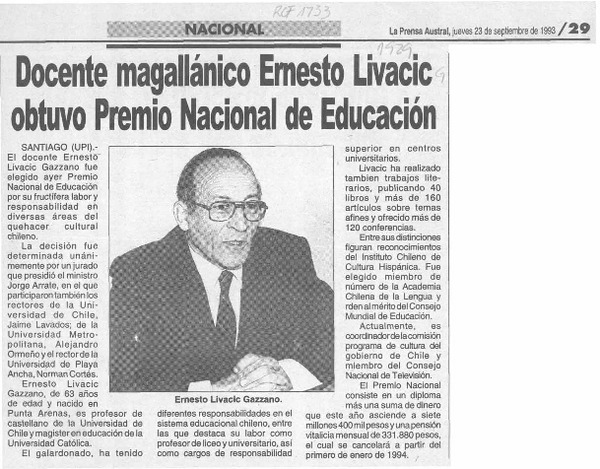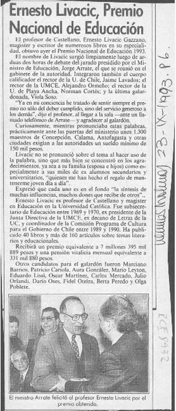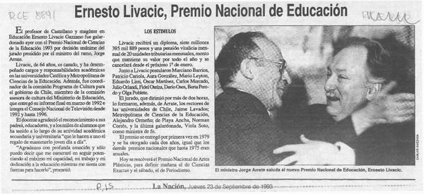 Ernesto Livacić, Premio Nacional de Educación [artículo].