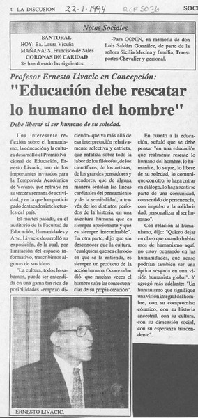 "Eduación debe rescatar lo humano del hombre" [artículo].