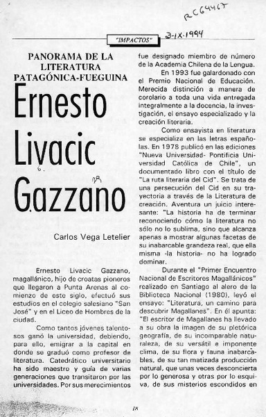 Ernesto Livacic Gazzano [artículo] Carlos Vega Letelier.