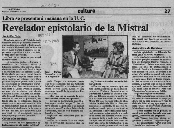 Revelador epistolario de la Mistral [artículo] Lillian Calm.