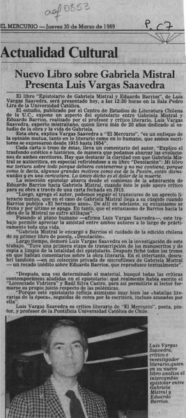 Nuevo libro sobre Gabriela Mistral presenta Luis Vargas Saavedra [artículo].