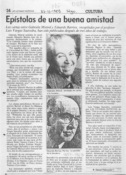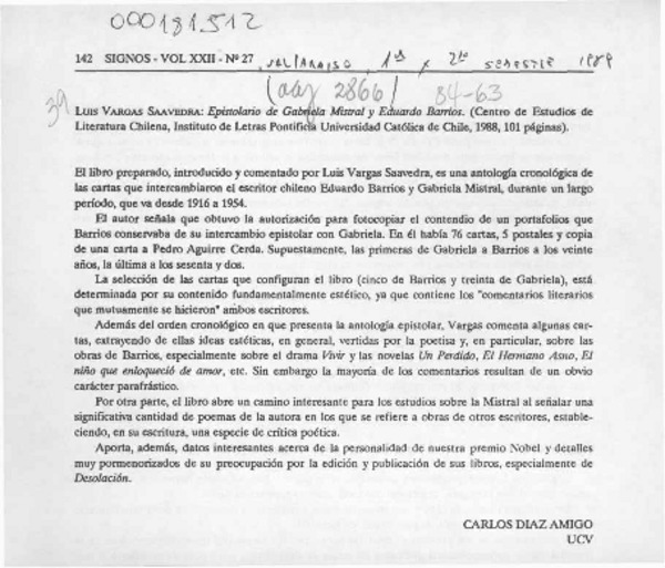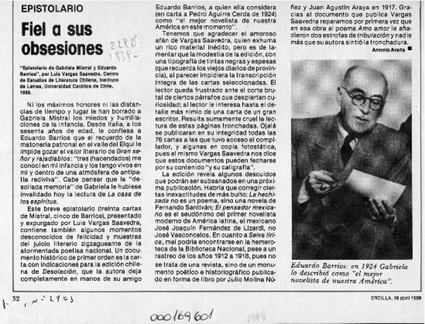 Luis Vargas Saavedra, "Epistolario de Gabriela Mistral y Eduardo Barrios" [artículo] Carlos Díaz Amigo.