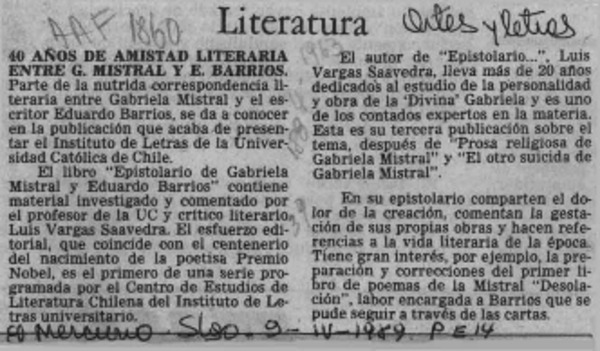 40 años de amistad literaria entre G. Mistral y E. Barrios [artículo].
