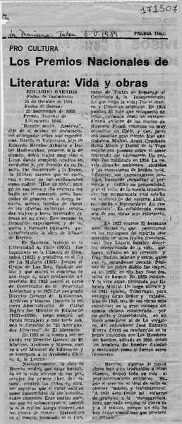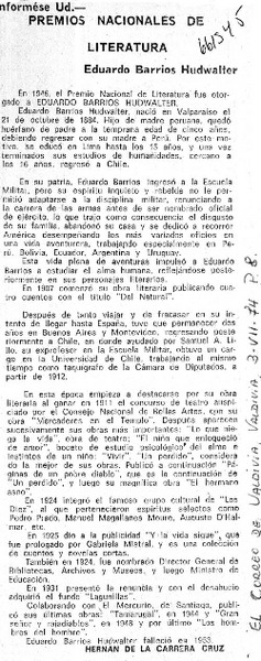 Eduardo Barrios, Premio Nacional de Literatura [artículo].