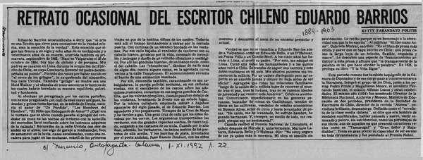 Retrato ocasional del escritor chileno Eduardo Barrios [artículo] Ketty Farandato Politis.