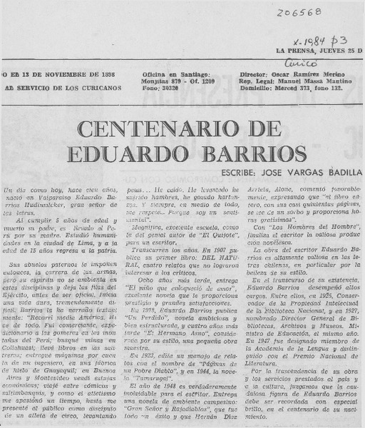 Centenario de Eduardo Barrios [artículo] José Vargas Badilla.